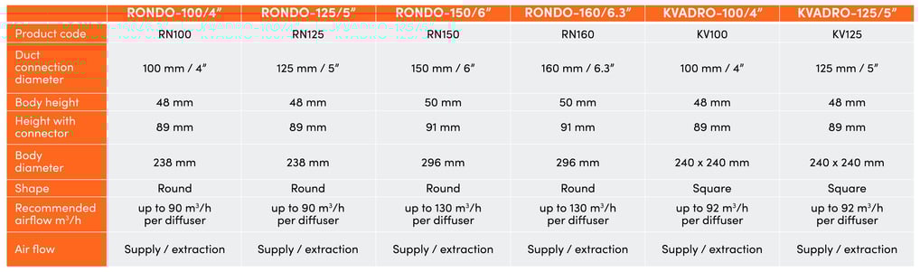 ERGOVENT RONDO, KVADRO tekniske egenskaber